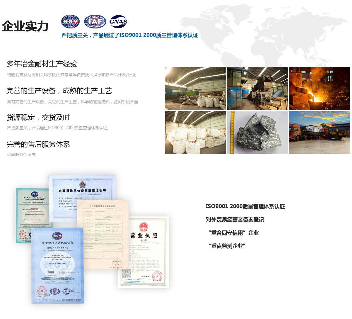 本廠擁有完善的生產(chǎn)設(shè)備,成熟的生產(chǎn)工藝,科學(xué)的管理模式,生產(chǎn)經(jīng)驗(yàn)豐富,技術(shù)力量雄厚,監(jiān)測(cè)手段齊全,生產(chǎn)產(chǎn)品主要有:硅鋁鋇鈣、硅鋁鋇、鋁錳、鋁錳鎂和多種煉鋼合金包芯線、噴吹料、硅錳等產(chǎn)品。